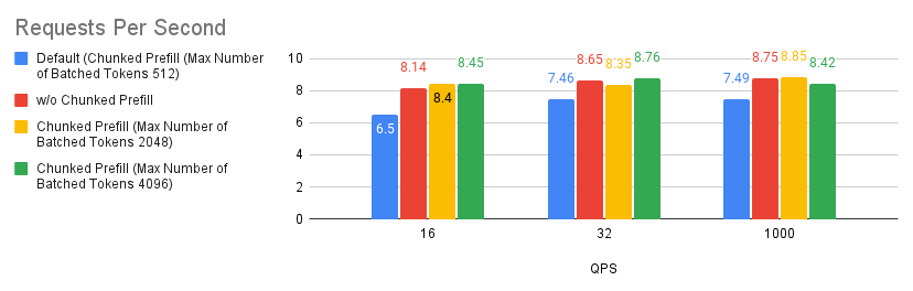 - In our experiments we found that the prefix caching hit rates of Bar 3 (yellow) and Bar 4 (green) are around 0.9% and 50%. Based on the comparison of Bar 3 (yellow) and Bar 4 (green) with the baseline and Bar 2 (red), this tells us that if the user requests do not have high prefix caching hit rate, disabling both chunked prefill and prefix caching might be considered a good rule of thumb.