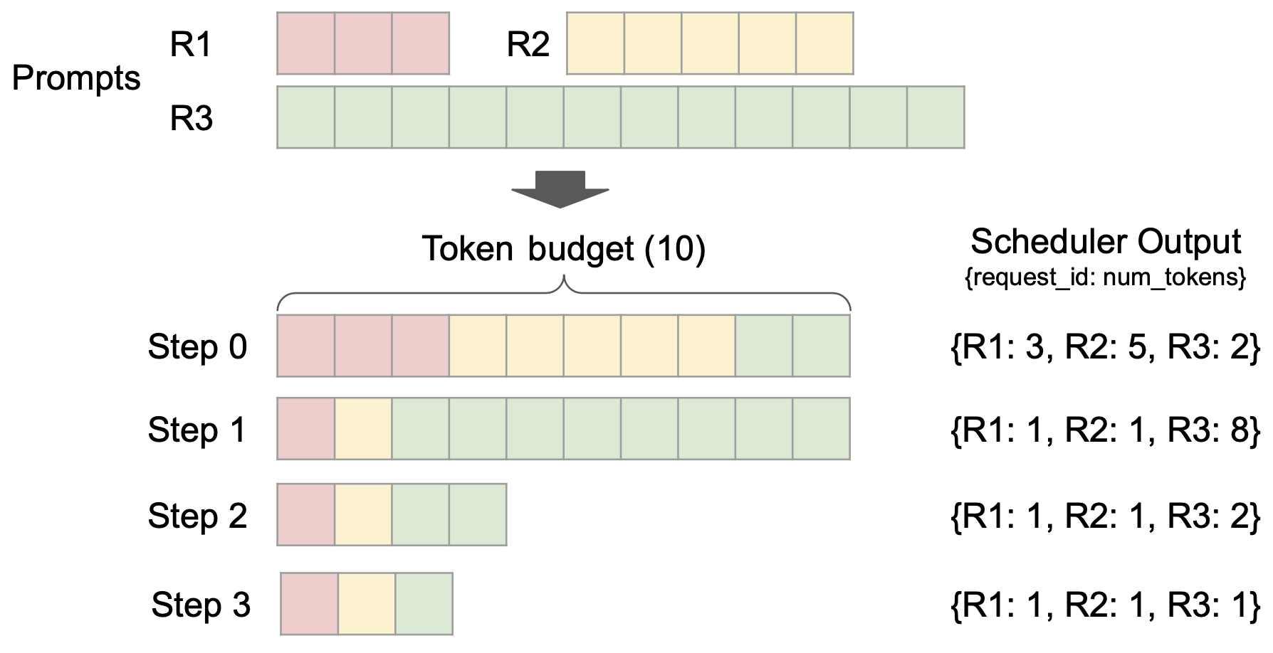 vLLM V1 introduces a simple yet flexible scheduler. It removes the traditional distinction between “prefill” and “decode” phases by treating user-given prompt tokens and model-generated output tokens uniformly. Scheduling decisions are represented as a simple dictionary, e.g., {request_id: num_tokens}, which specifies the number of tokens to process for each request at each step. We find that this representation is general enough to support features such as chunked prefills, prefix caching, and speculative decoding. For instance, chunked-prefill scheduling is seamlessly implemented: with a fixed token budget, the scheduler dynamically decides how many tokens to allocate to each request (as shown in the figure above).