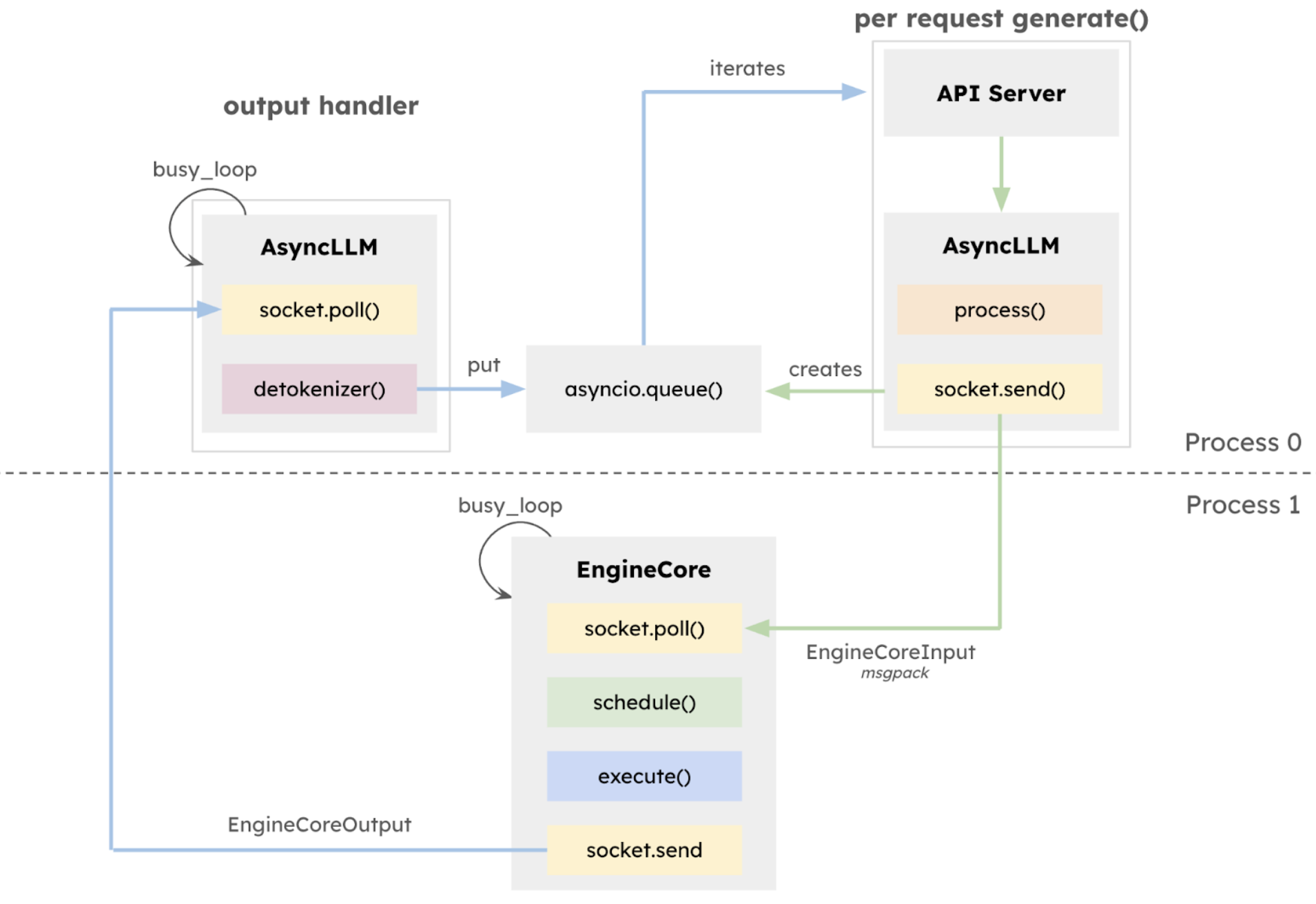 In the v0.6.0 release, vLLM introduced a multiprocessing API server utilizing ZeroMQ for IPC, enabling overlap between the API server and AsyncLLM. vLLM V1 extends this by integrating the multiprocessing architecture deeper into the core of AsyncLLM, creating an isolated EngineCore execution loop that focuses exclusively on the scheduler and model executor. This design allows for greater overlap of CPU-intensive tasks—such as tokenization, multimodal input processing, de-tokenization, and request streaming—with the core execution loop, thereby maximizing model throughput.