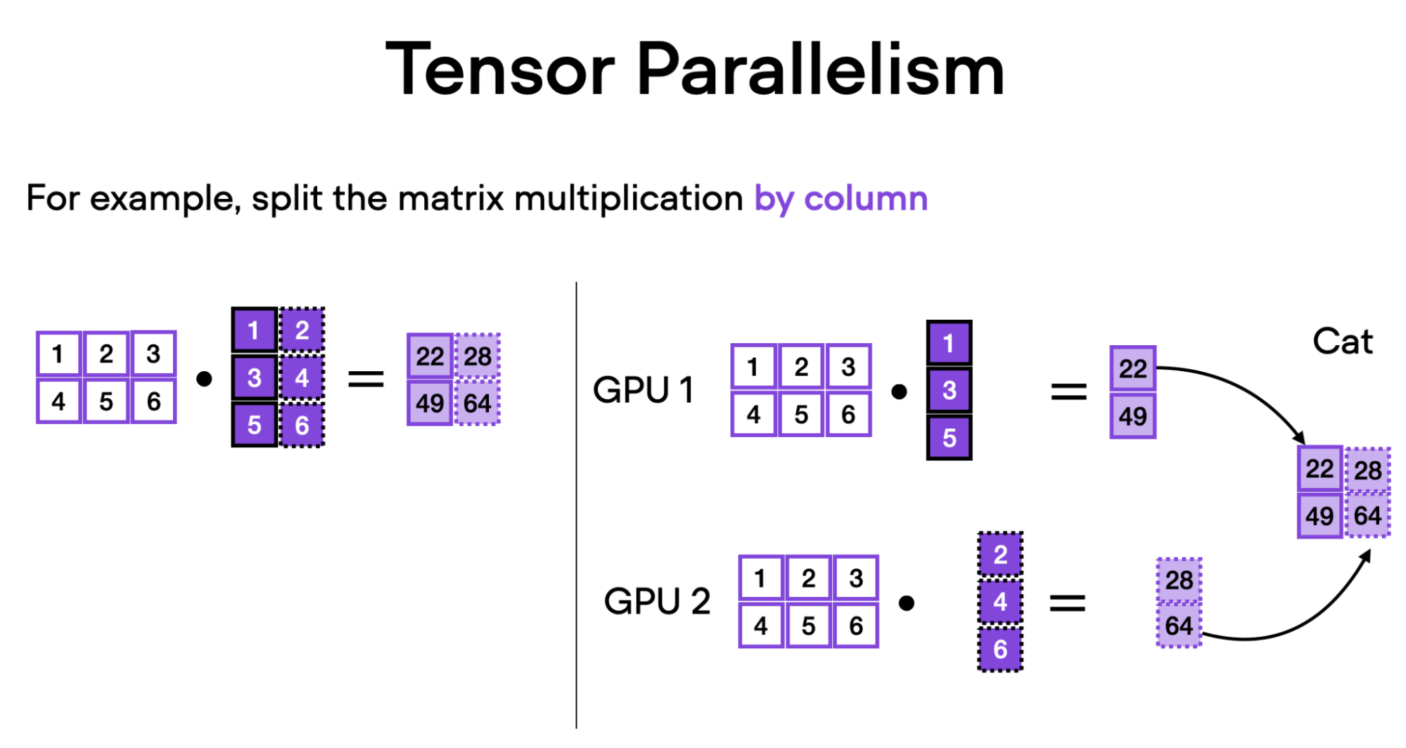 - Column Parallelism: Splitting weight matrices along columns and concatenating results after computation.